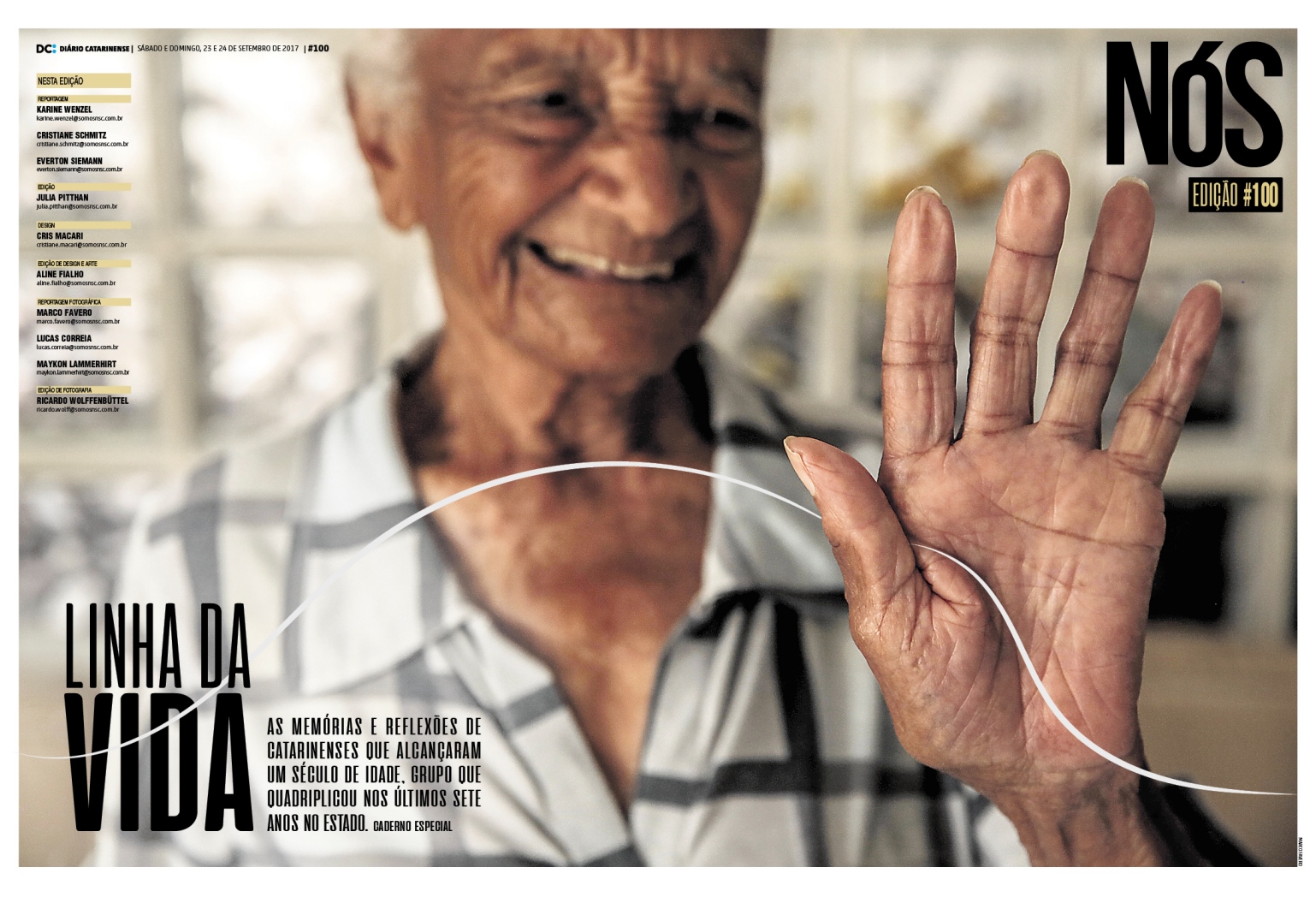 A reportagem sobre os centenários catarinenses, que será publicada no Nós #100, vai contar as memórias e reflexões de quem presenciou os acontecimentos locais e nacionais do último século. O conteúdo será distribuído em 12 páginas no impresso e um especial multimídia na versão online. A produção contou com reportagem de Karine Wenzel, Cristiane Schmitz e Everton Siemann, edição de Julia Pitthan, design de Cris Macari, edição de design e arte de Aline Fialho, reportagem fotográfica e Marco Favero, Lucas Correia e Maykon Lammerhirt e edição de fotografia de Ricardo Wolffenbüttel.