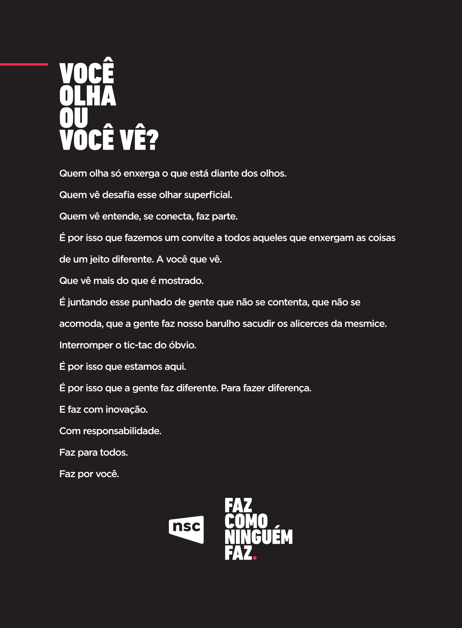 “Nosso objetivo é exaltar uma das características do catarinense: de ser um povo de ação, que não se acomoda. Todos os dias, entramos na casa de milhões de lares levando conteúdo de qualidade por meio do jornalismo, do entretenimento e das produções comerciais, e esse público sabe que ninguém faz melhor do que nós, os catarinenses, porque nos empenhamos neste propósito. Este movimento é a reafirmação de uma de nossas premissas, que contribui com o todo o mercado e também com a autoestima dos nossos profissionais, que fazem como ninguém faz”, afirma Mário Neves, presidente da NSC.