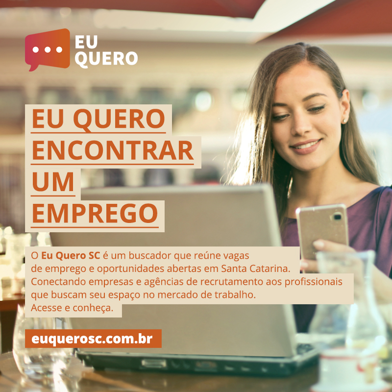 O EU QUERO SC nasce com identidade visual moderna e interatividade que facilita as buscas. Por meio de palavras-chaves ou filtros que segmentam por região e área de atuação, também será possível selecionar vagas de acordo com os horários de trabalho — meio período ou tempo integral —, ou de acordo com o perfil desejado, incluindo estágios e vagas para freelancer. O layout intuitivo também contribui para um processo de cadastro e candidatura simplificado, com a conexão direta entre empresa e candidato. Conheça o Eu Quero SC em www.euquerosc.com.br e saiba mais sobre a nova ferramenta de oportunidades catarinense.